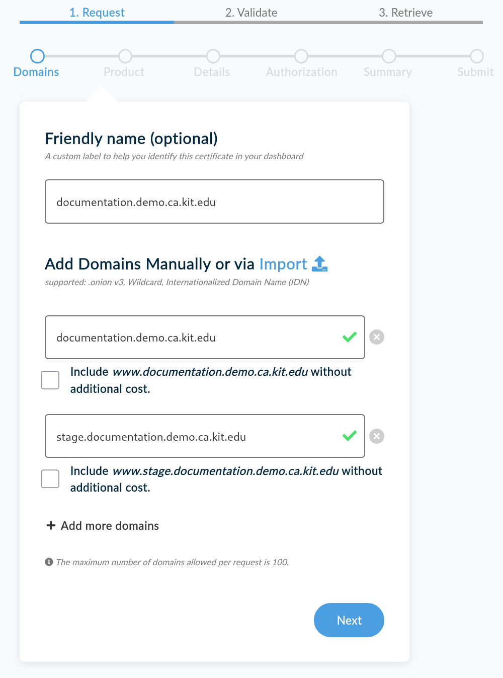 Geben Sie alle Domainnamen für ihr Zertifikat ein. Sofern nicht gewünscht, wählen Sie die Option Include www… ab.