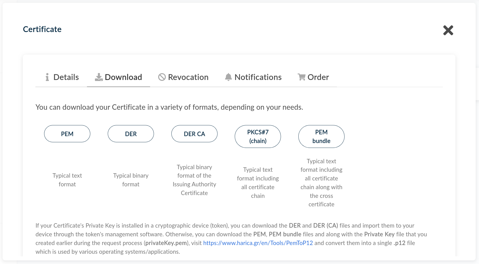 Wir stellen das Zertifikat nach Prüfung der oben beschriebenen Berechtigungen aus. Sie bekommen dann von HARICA eine E-Mail und können für das Zertifikat dann im Dashboard den Download-Dialog öffnen (-Icon links neben ).