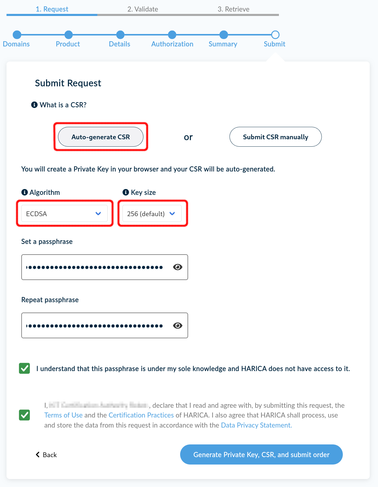 Vergeben Sie ein Passwort für den privaten Schlüssel, haken Sie beide Felder an und klicken Generate Private Key, CSR, and submit order.