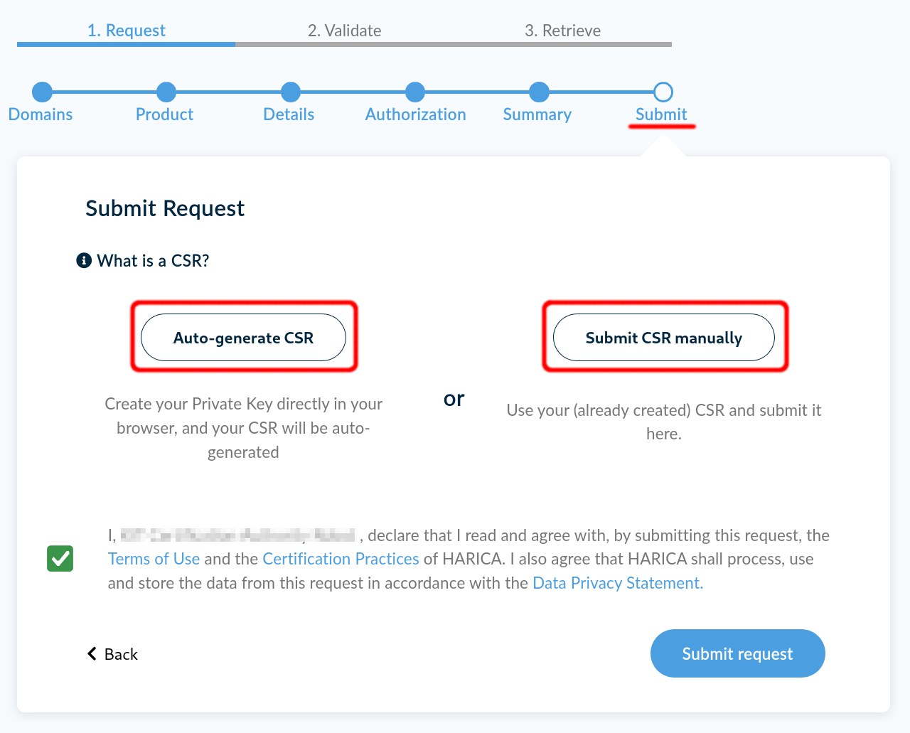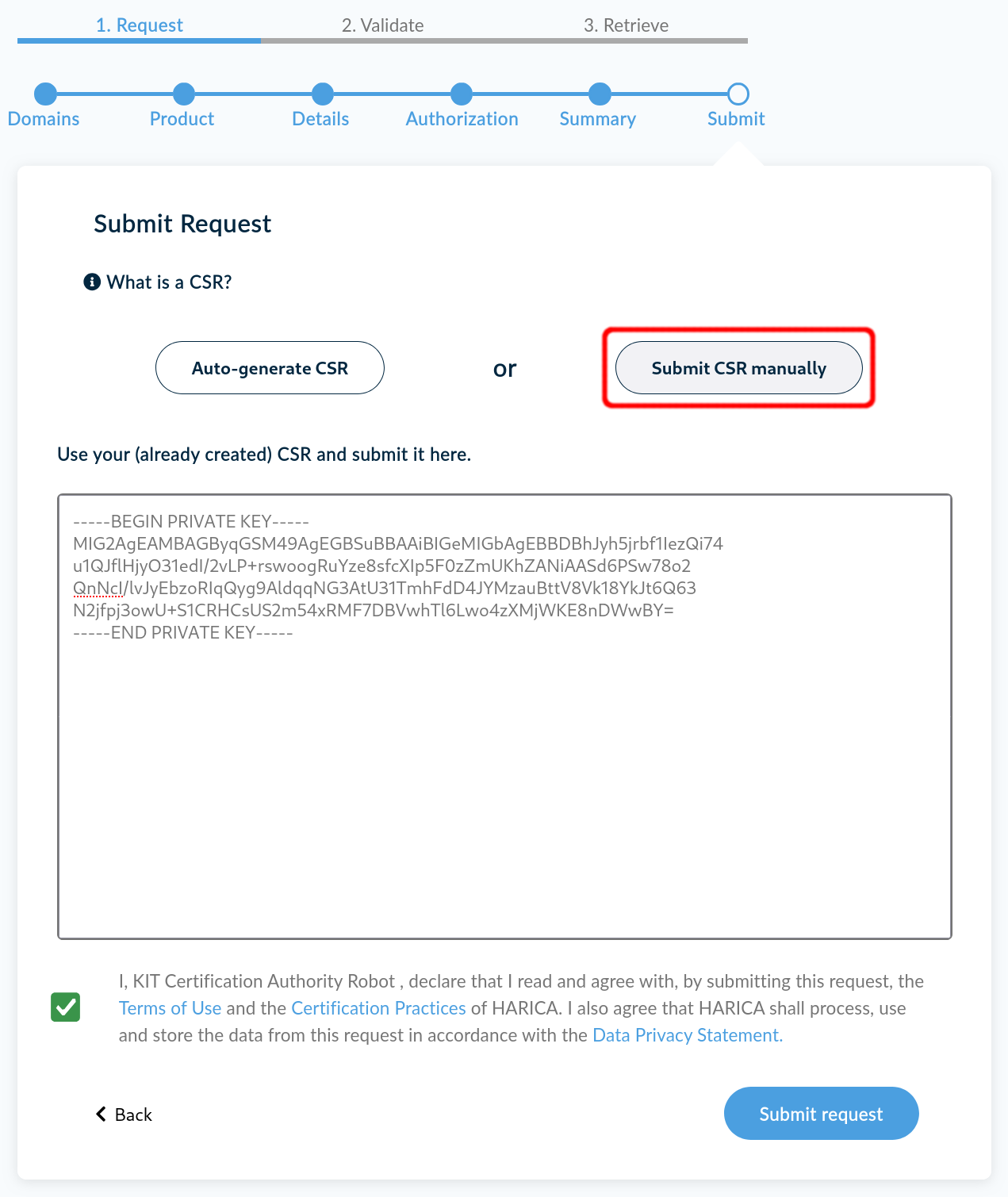 Kopieren Sie den Inhalt ihres Zertifikat-Requests in das Textfeld, setzen Sie den Haken darunter und klicken Sie Submit request.