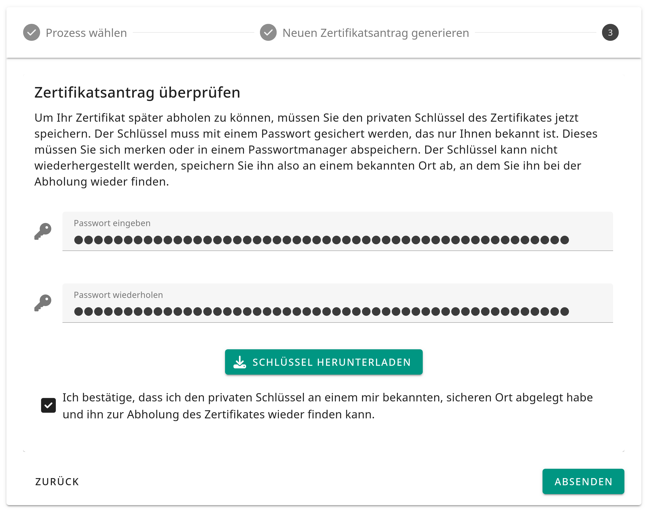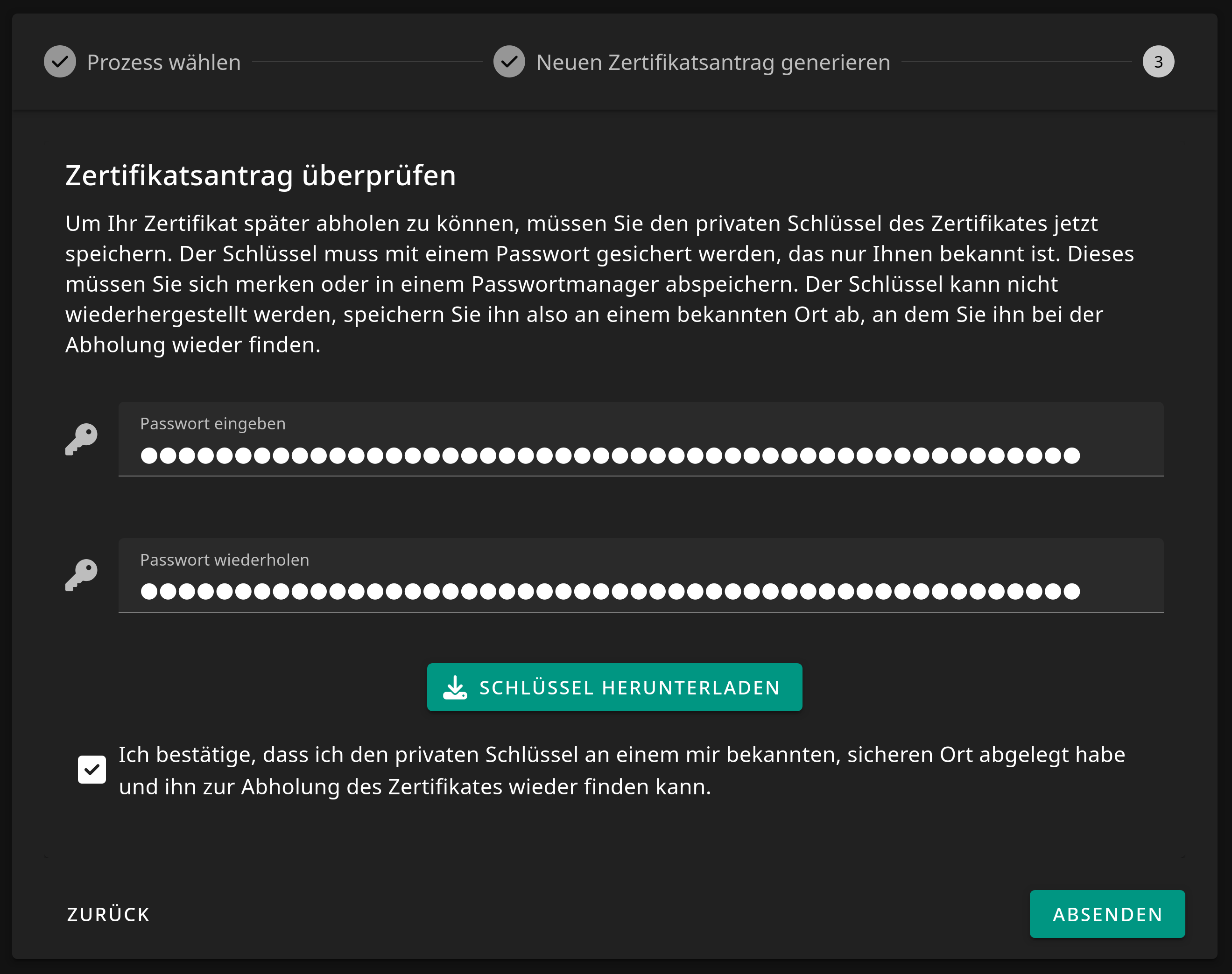 Jetzt werden nochmal alle Daten angezeigt, die ins Zertifikat geschrieben werden. Wählen Sie Absenden, wenn alles