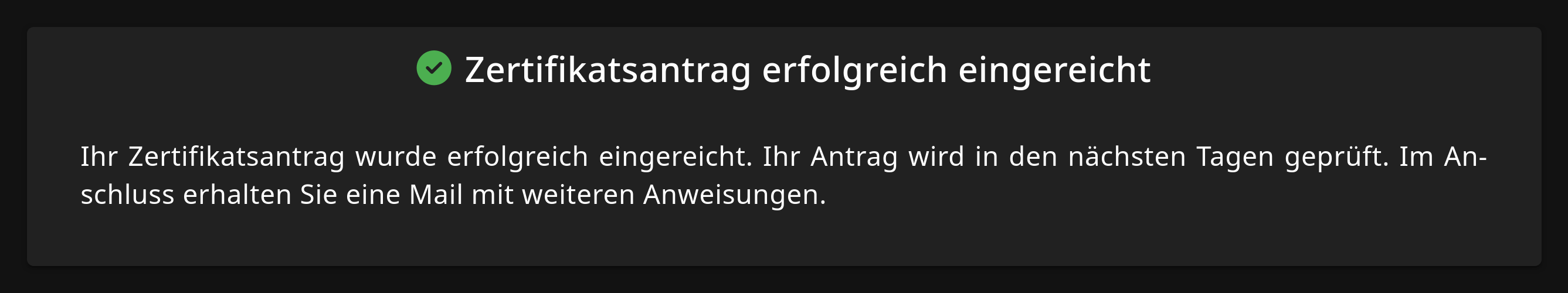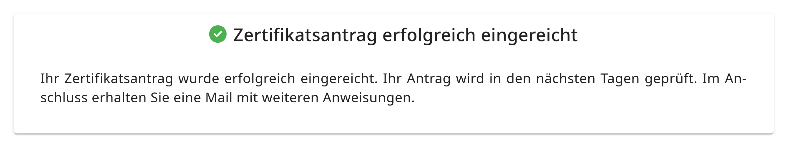 Nachdem Sie nochmals auf Absenden geklickt haben, müssen Sie abwarten, bis wir das Zertifikat ausgestellt haben.