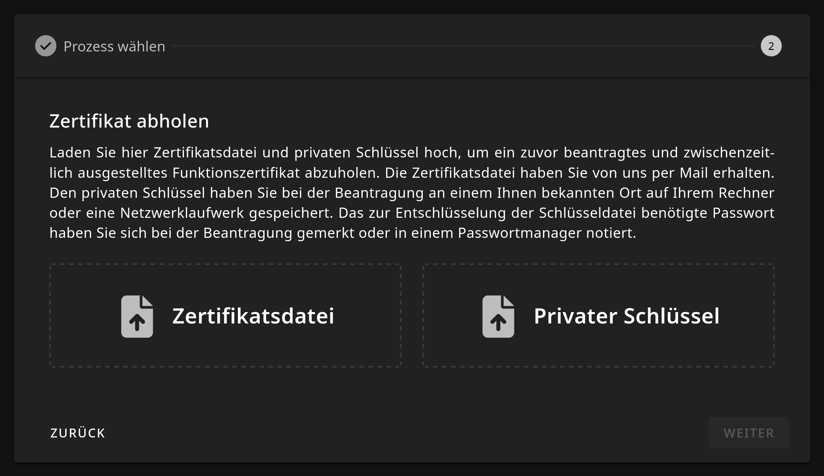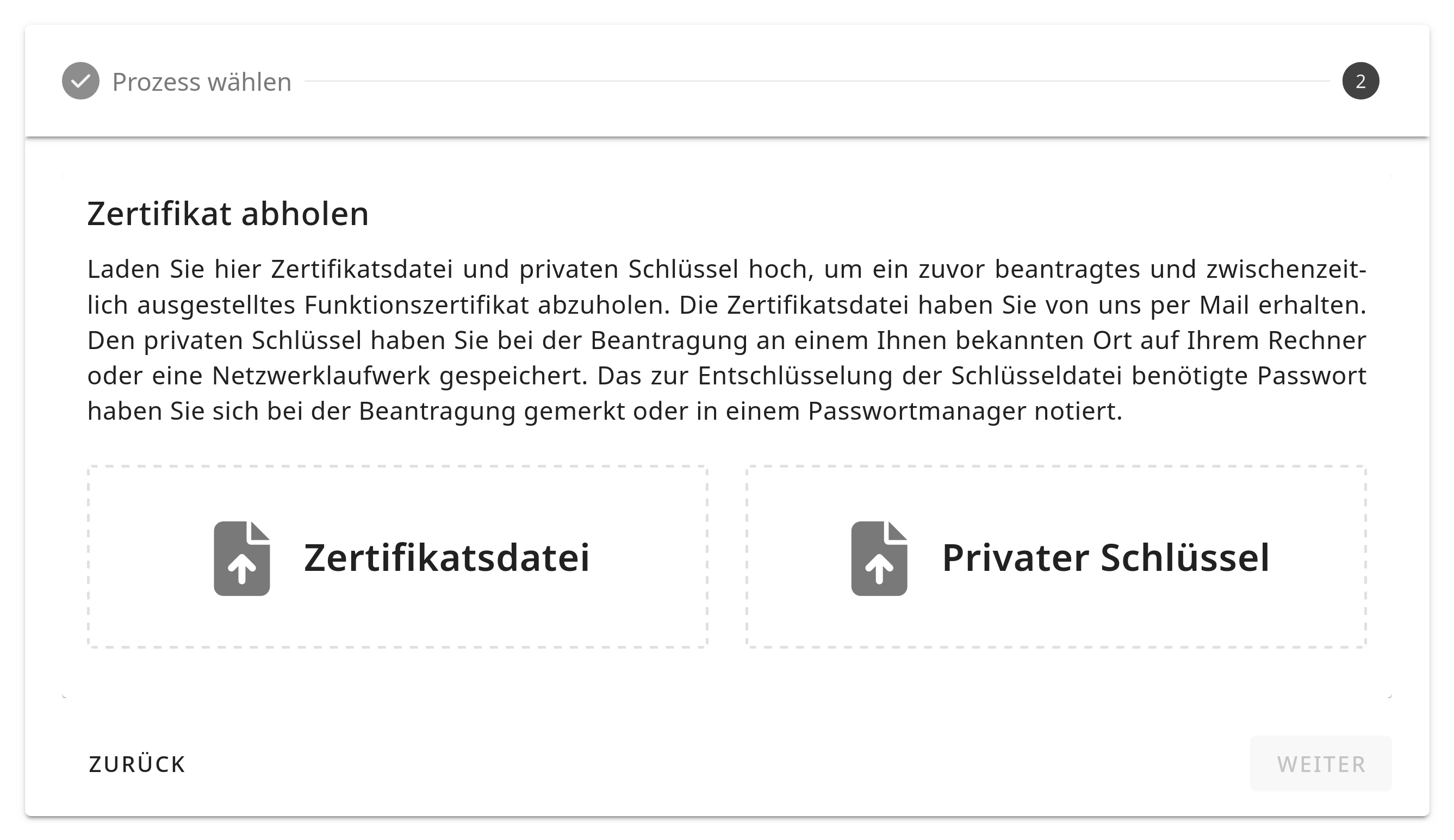 Um ein neues Zertifikat zu beantragen, wählen Sie “Beantragen” und folgen Sie dem Abschnitt Beantragen. Möchten Sie ein Zertifikat abholen, das wir bereits ausgestellt haben, wählen Sie “Abholen” und folgen Sie dem Abschnitt Abholen.