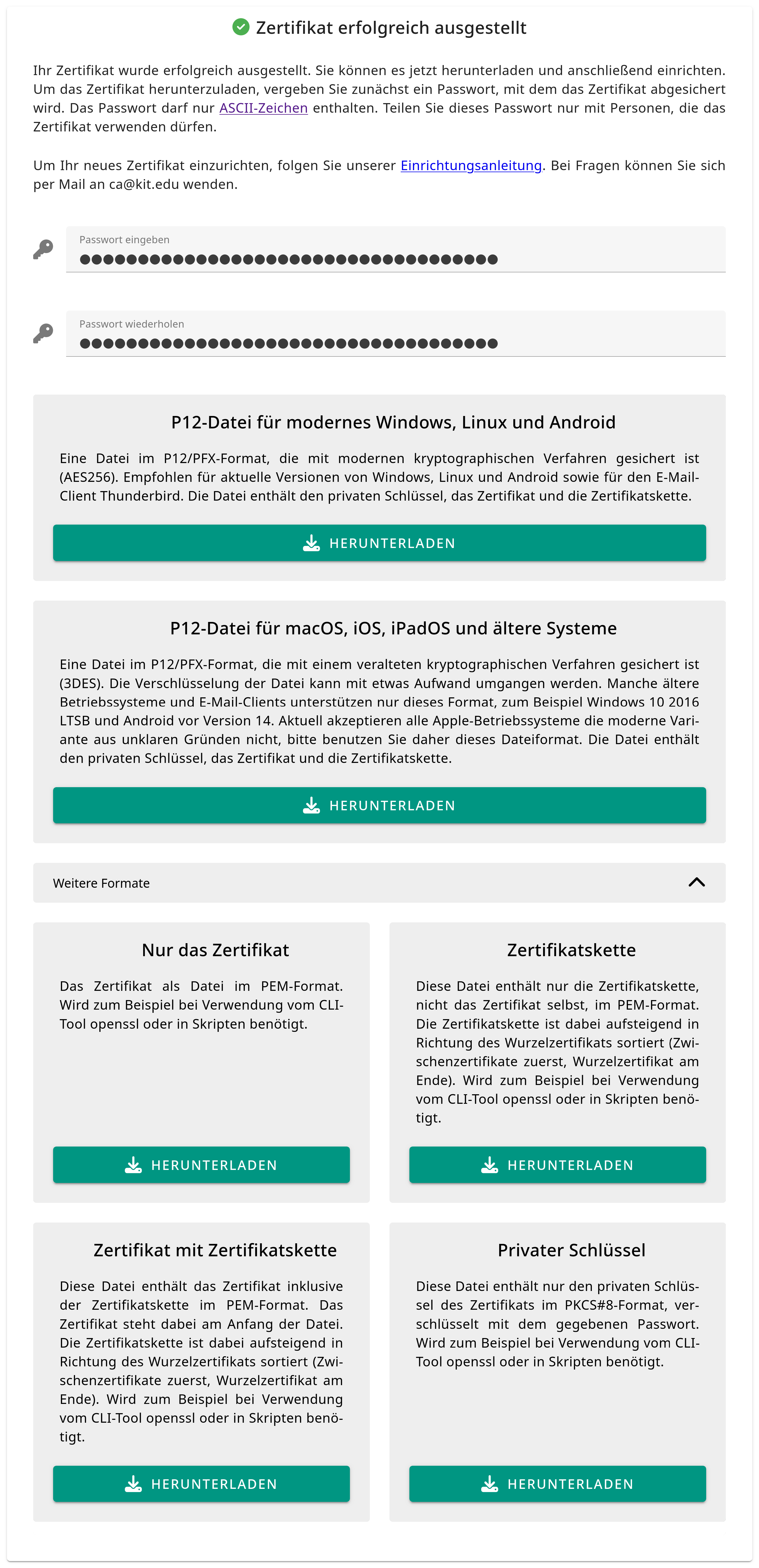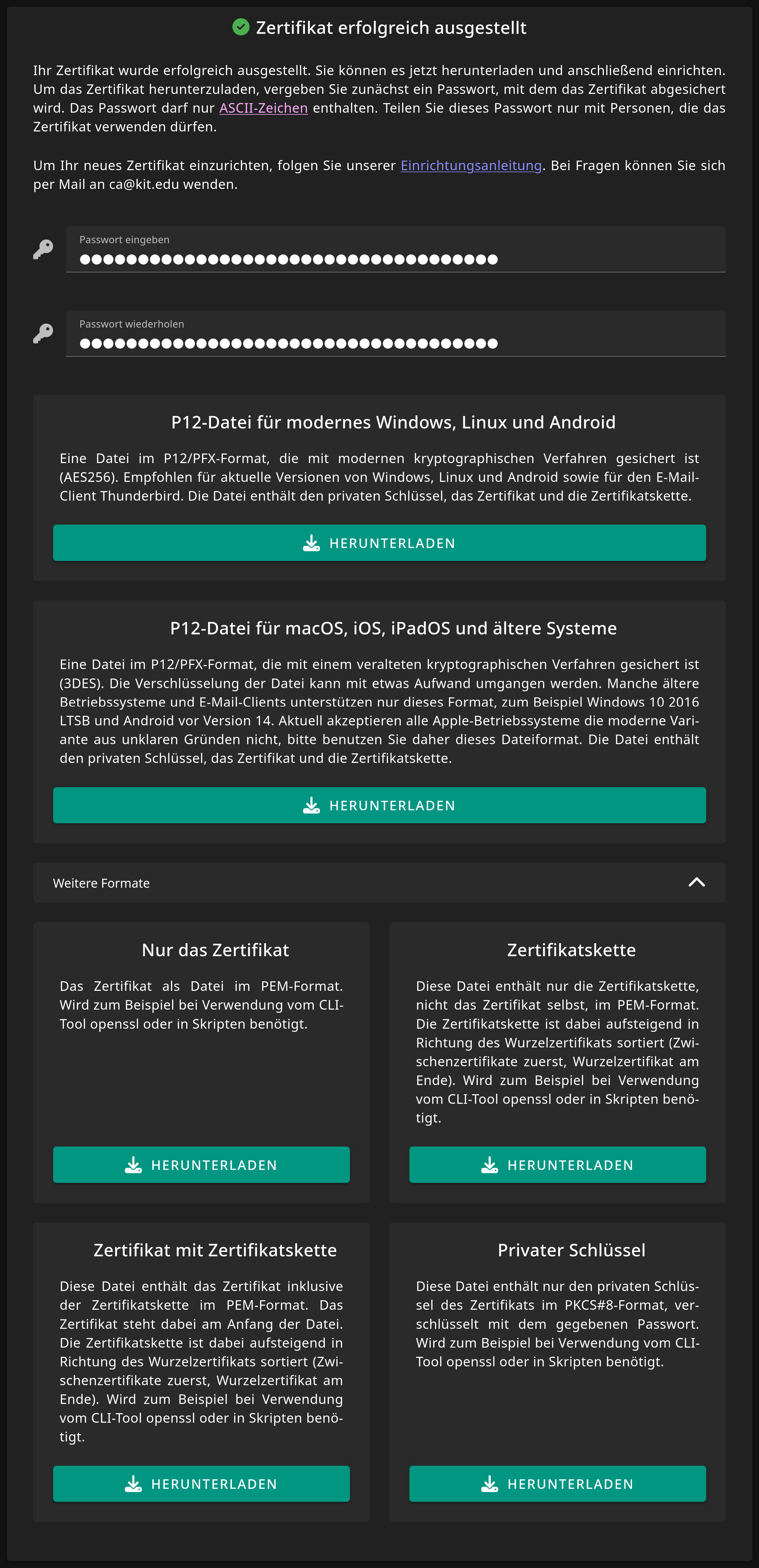 Vergeben Sie zunächst ein Passwort, mit dem Ihre Zertifikatsdatei verschlüsselt wird. Ist das Passwort gültig, erscheinen mehrere Dateiformate, in denen Sie Ihr Zertifikat herunterladen können. Bei allen Formaten ist beschrieben, in welchem Fall Sie es verwenden sollten. Klicken Sie bei dem für Sie passenden Format auf “herunterladen” und speichern Sie die Datei an einem passenden Ort ab.