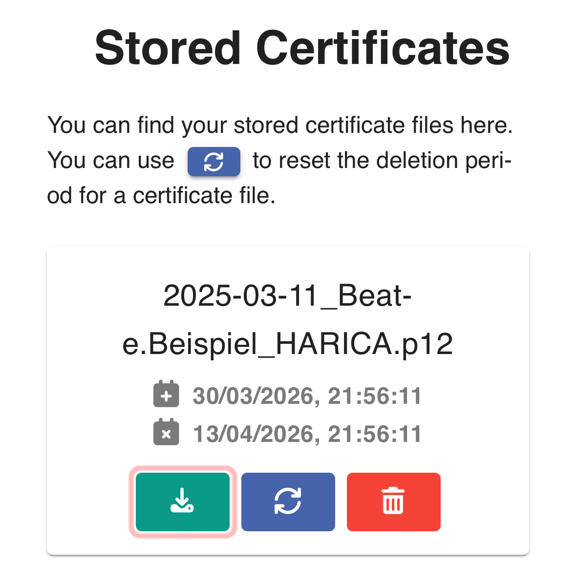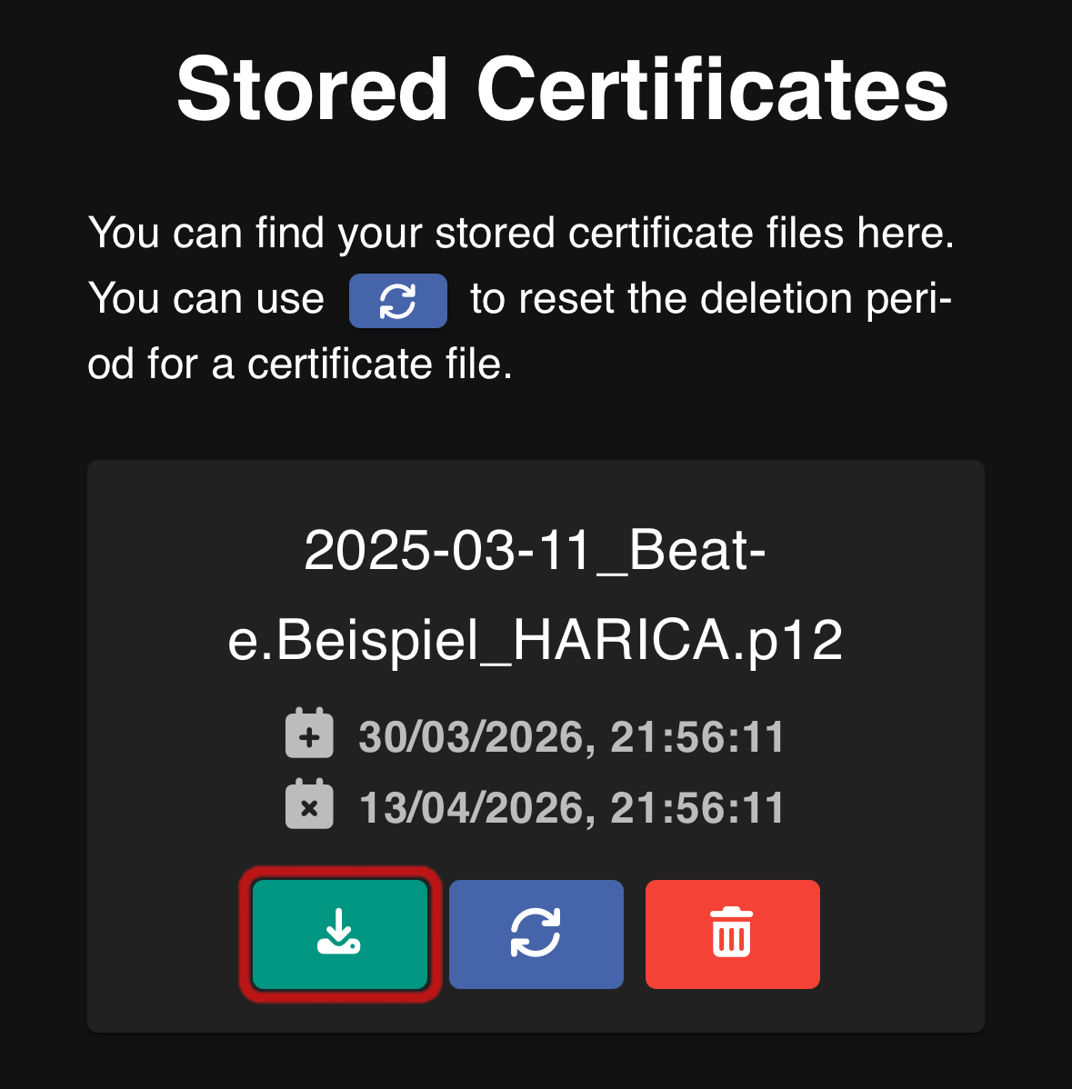 Locate the certificate you want to install and click the download button ():
