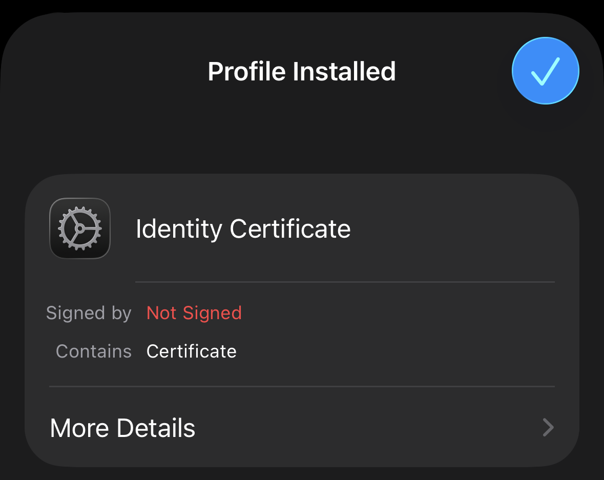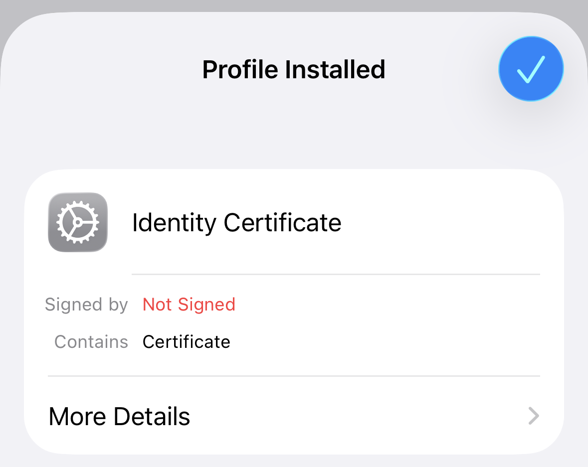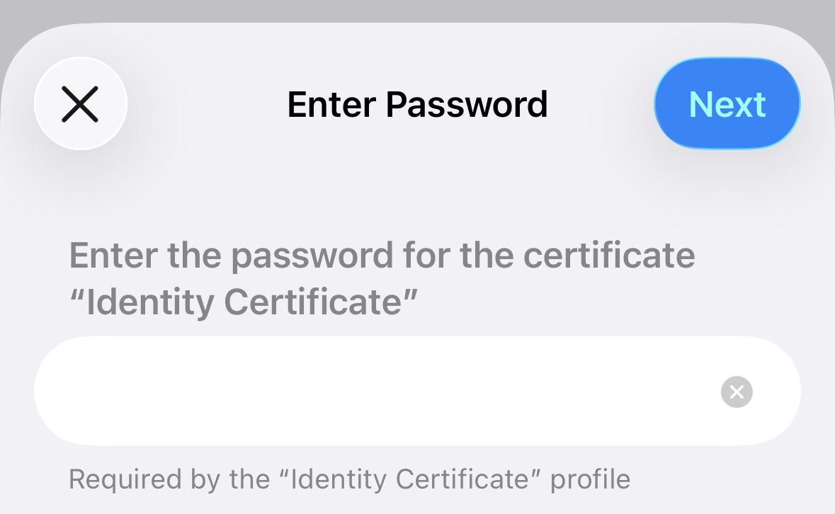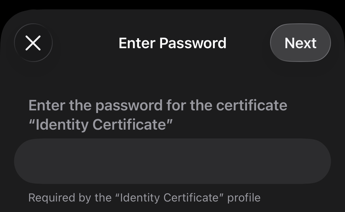Keep tapping Install or Next until the profile is installed. When prompted, enter your device PIN and the password of the PKCS12 file: