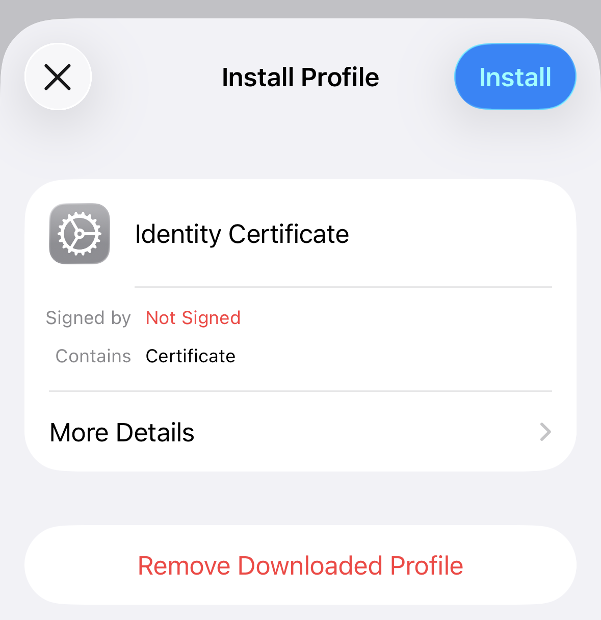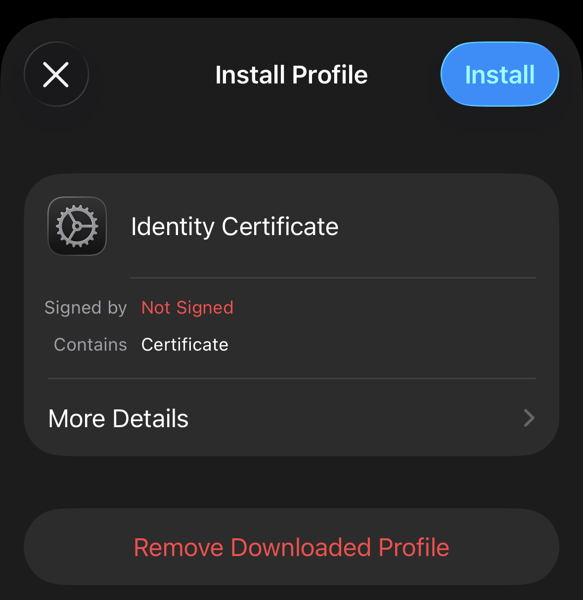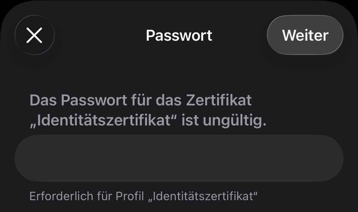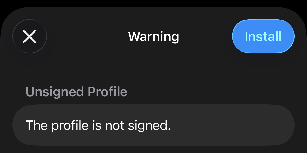 Keep tapping Install or Next until the profile is installed. When prompted, enter your device PIN and the password of the PKCS12 file: