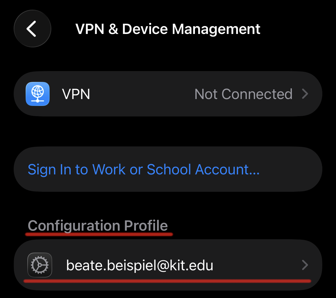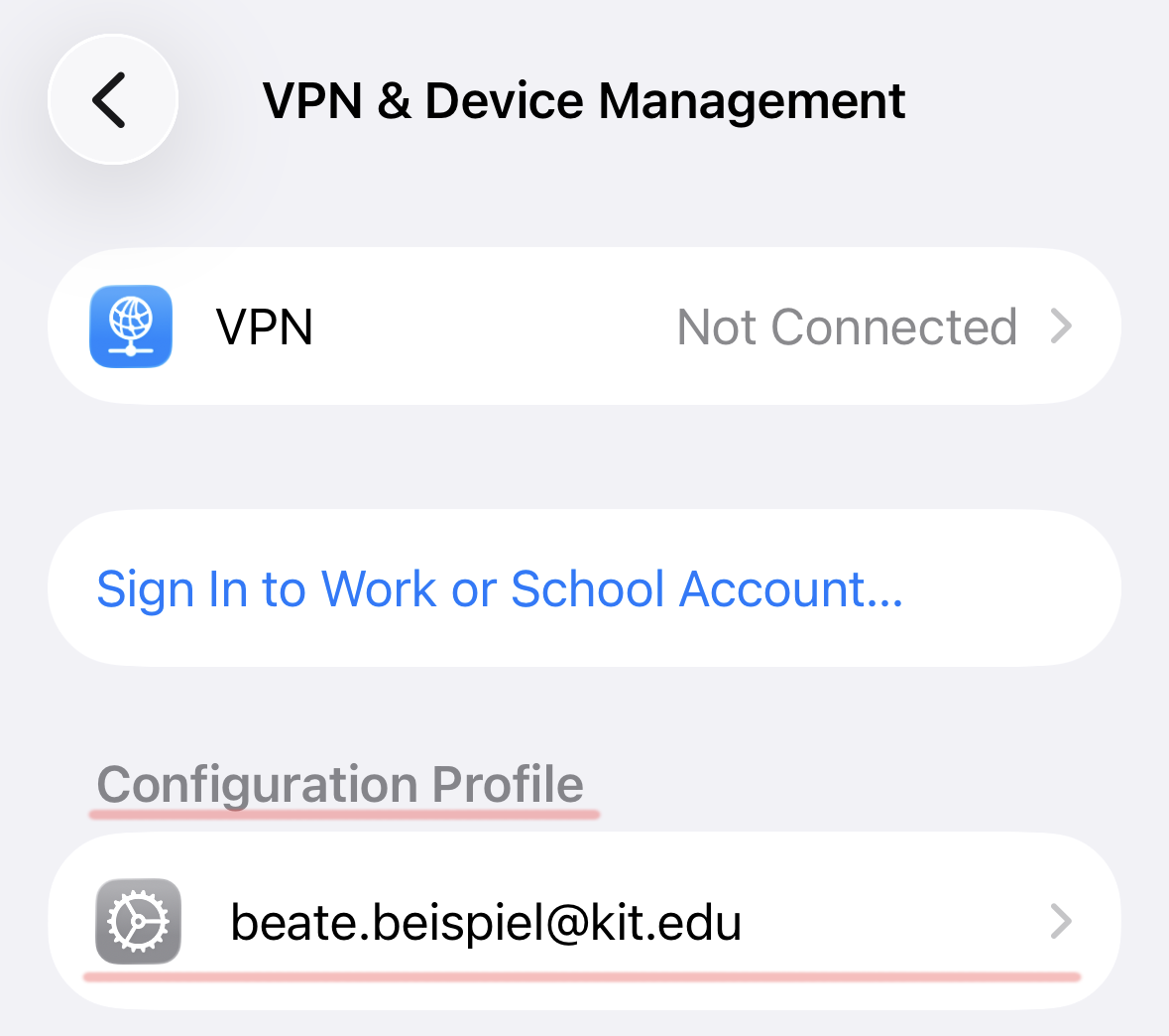 You can view and manage your configuration profiles in the Settings app under General → VPN & Device Management: