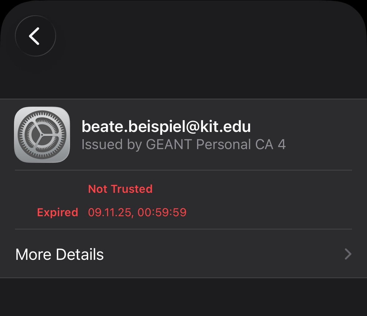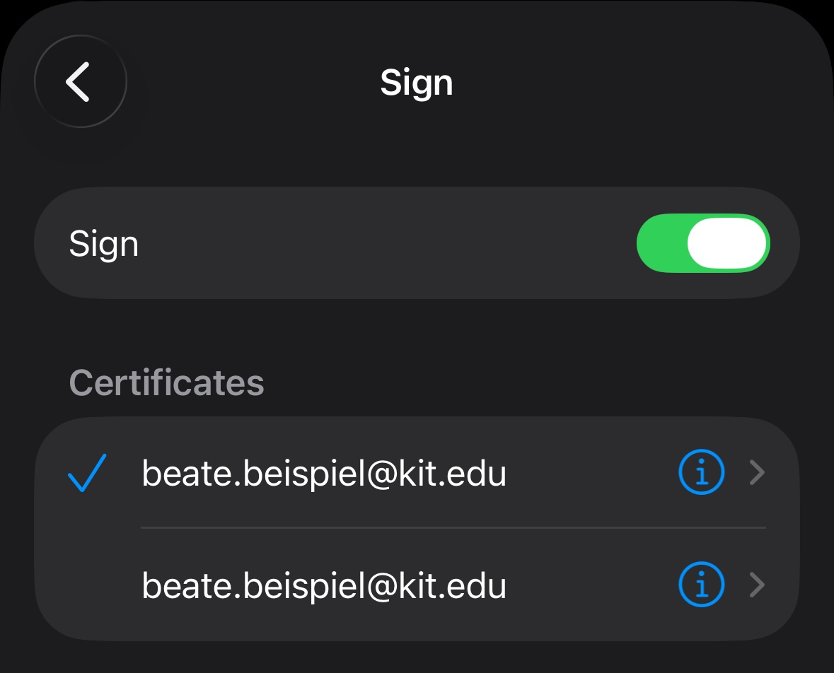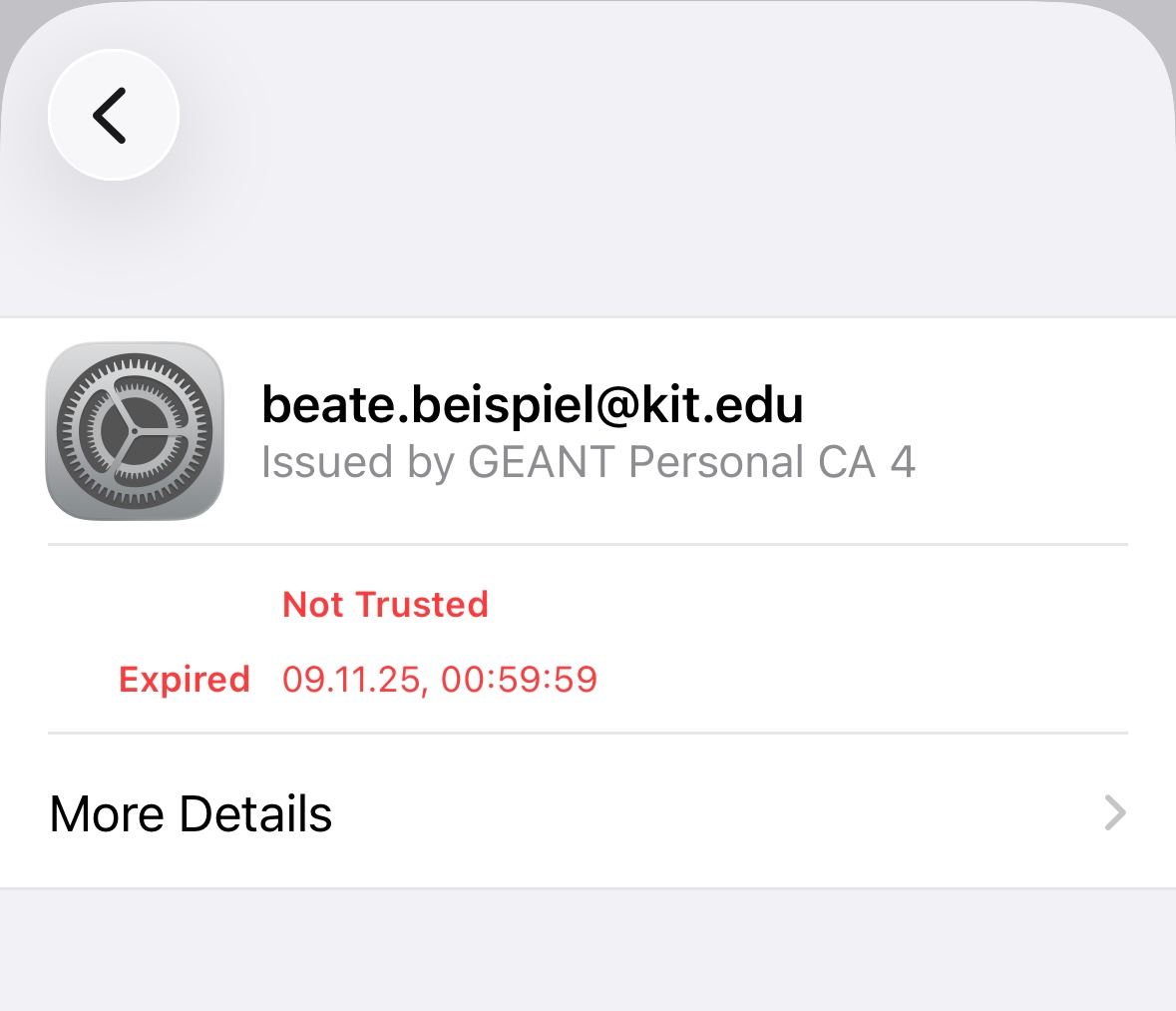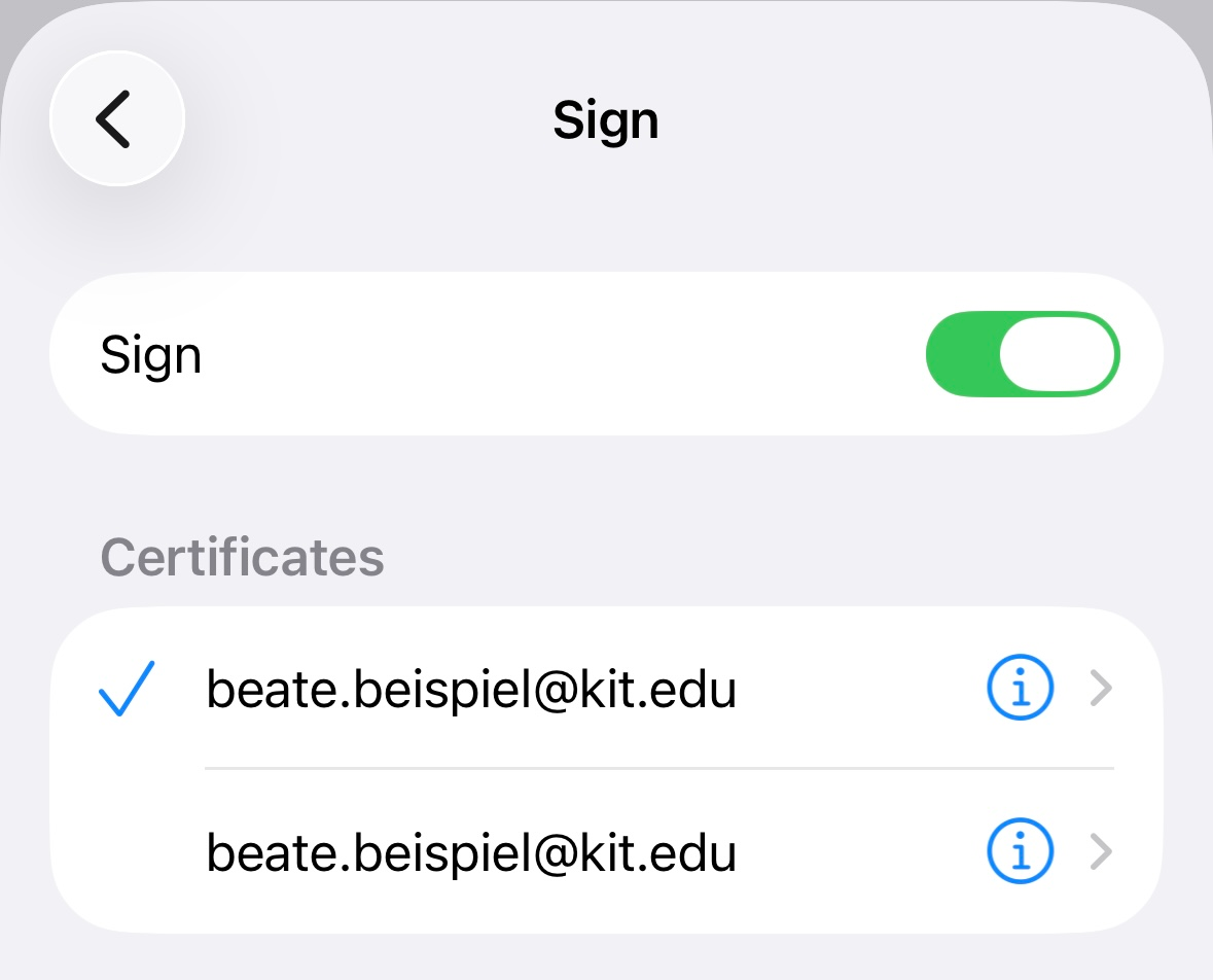 in the account settings does not match the one in the certificate. Example: beate.beispiel@kit.edu is not the same as